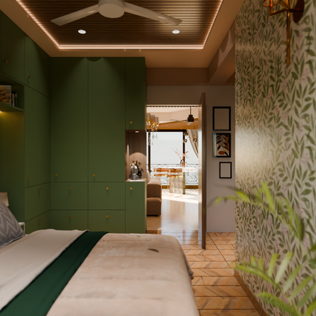 The Ahluwalia Residence reimagines an apartment into a luxurious sanctuary with a bold, geometric vision centered around striking triangular shapes. Departing from the conventional, this design offers a sophisticated transformation tailored to a distinguished army family with a taste for elegance. The reconfigured layout expertly balances functionality with opulence, while sage green elegantly threads through the living, dining, and kitchen spaces. Intricate ceiling and wall treatments add layers of visual intrigue, harmonizing with the overall refined aesthetic. This transformation not only caters to the family’s unique needs but also embodies their rich, distinguished style.